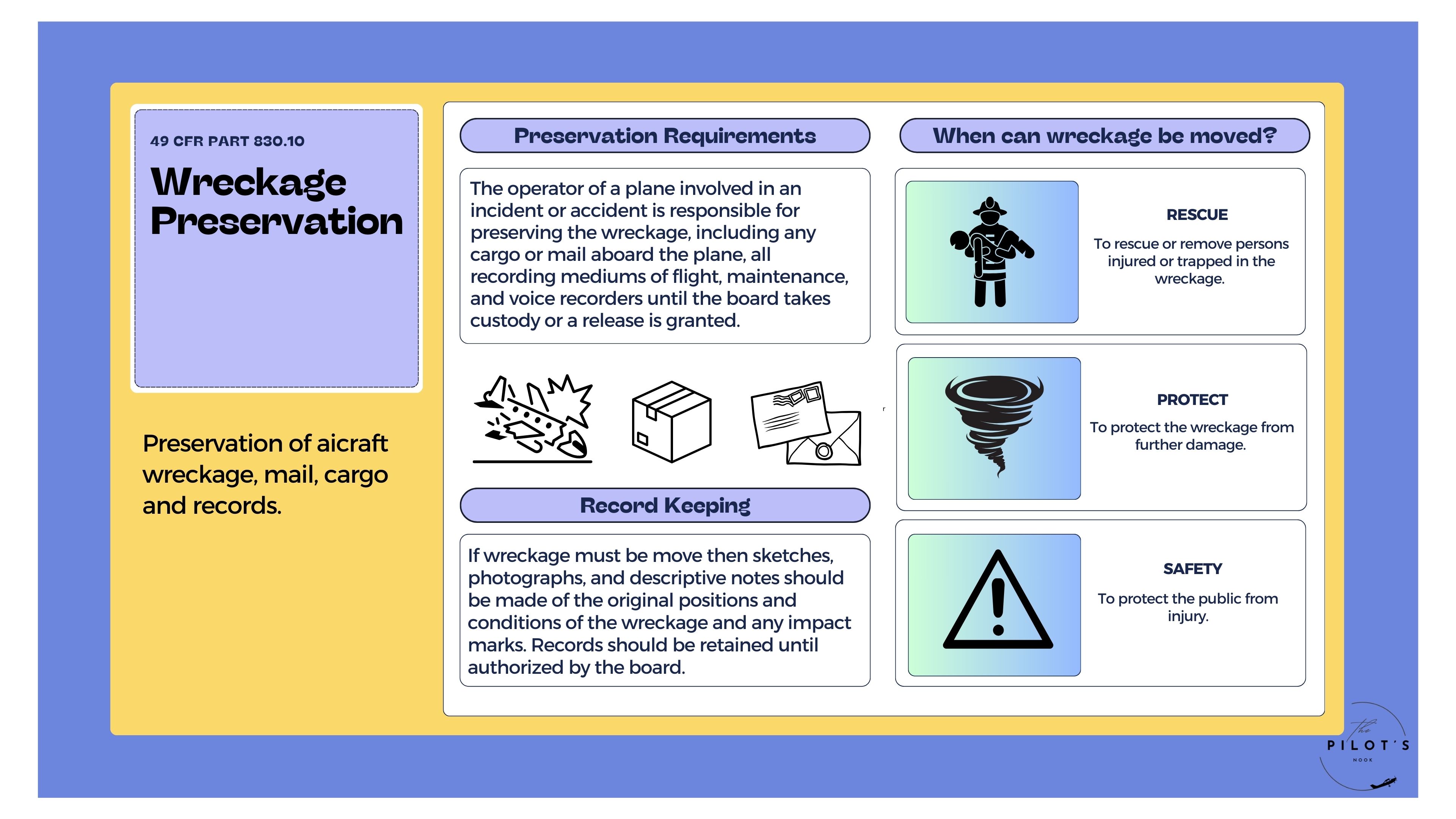 Infographic outlining 49 CFR Part 830.10 regarding wreckage preservation.