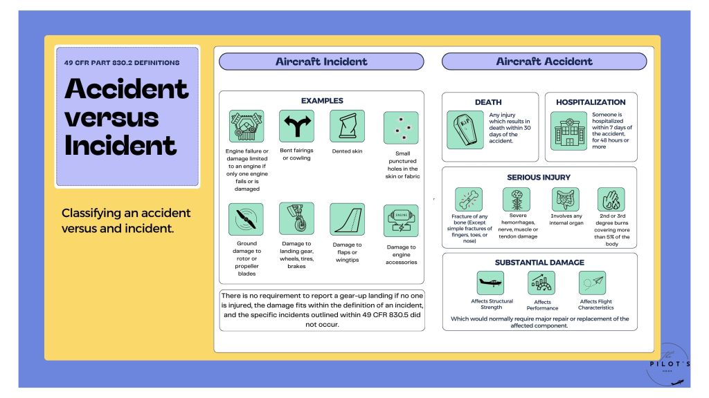Infographic showing the difference between an accident and an incident based on 49 CFR Part 830.2.