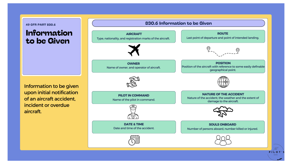 Infographic outlining when an immediate notification is required after an accident or serious incident per 49 CFR Part 830.5. Also includes 830.6, which is information to be given upon initial notification of an accident, serious incident or overdue aircraft.